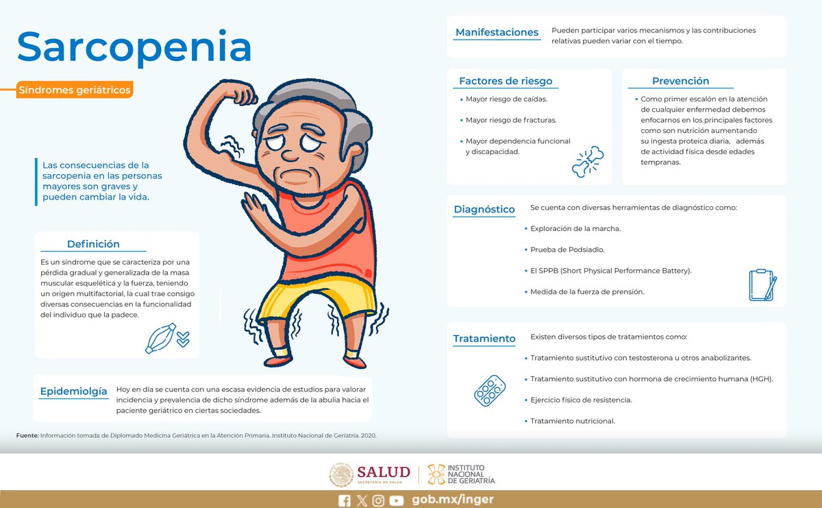 Sarcopenia: pérdida progresiva de masa y fuerza muscular que limita la capacidad para realizar actividades cotidianas como caminar, levantarse o subir escaleras.