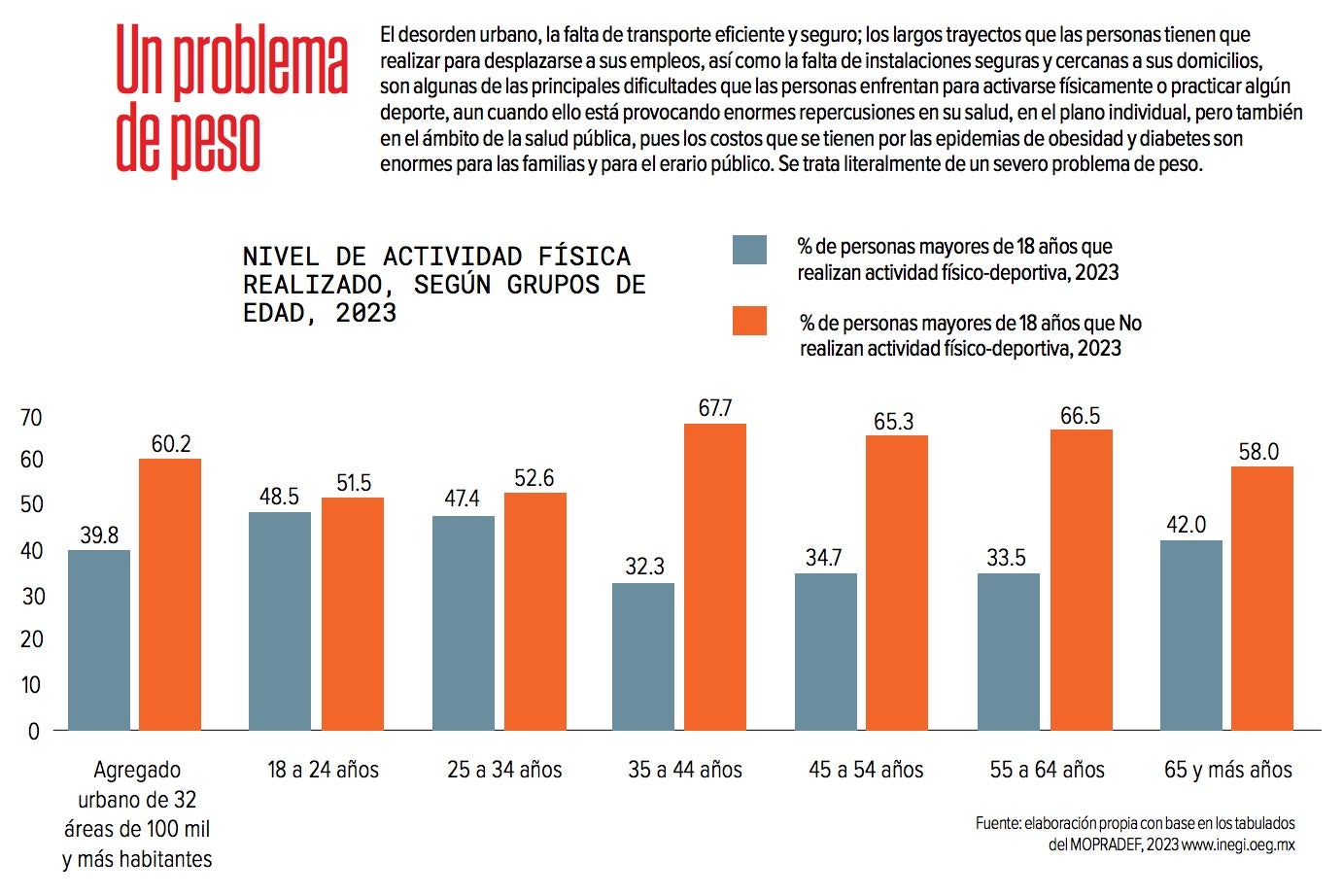 En México, los índices de inactividad física son preocupantes. Según datos recientes del Instituto Nacional de Estadística y Geografía (INEGI, 2023), más de la mitad de la población adulta —alrededor del 56 %— no realiza suficiente actividad física, y en el caso de los adultos mayores, las cifras son aún más altas. De acuerdo con estimaciones de la Organización Panamericana de la Salud (OPS, 2024), la falta de movimiento coloca a millones de personas en riesgo de desarrollar enfermedades crónicas como diabetes, hipertensión, obesidad y problemas cardiovasculares.
